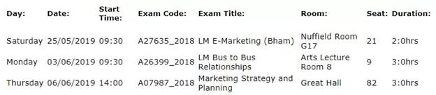 英国大学的考试科目,时间,地点,考场以及座位号,通常会以邮件的形式发送给学生,或者大家可以直接登录学校官网查询。例如伯明翰大学发给学生的考试时间表,里面从左到右依次为考试日期,考试时间,科目代码,科目名称,考场,座位号和考试时长: