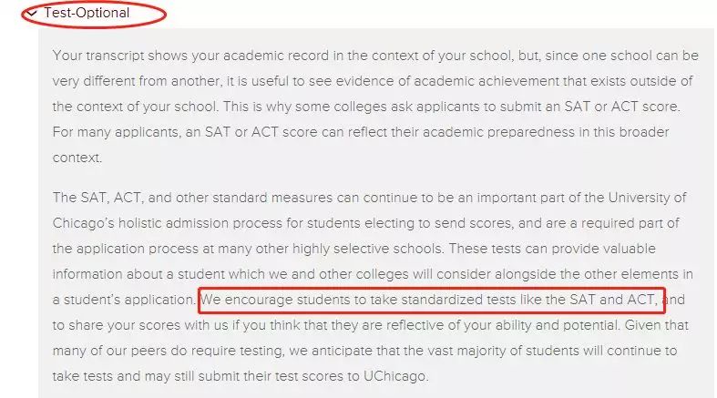 去年芝加哥大学发布实行Test-Optional政策这一消息的时候,我们就发过相关文章,说好的不要标化,下面又非要写鼓励递交的字眼。