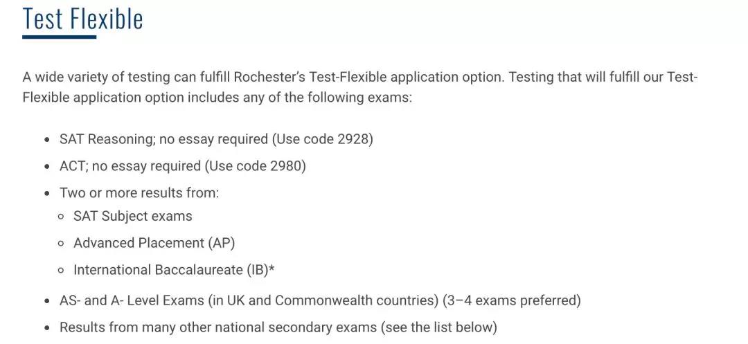 2. 引人犹豫不决的Test-Flexible政策:需要递交标化成绩,但是不限于SAT/ACT,你也可以用AP/IB/SAT2等考试成绩来替代。典型代表:罗彻斯特大学、纽约大学等。