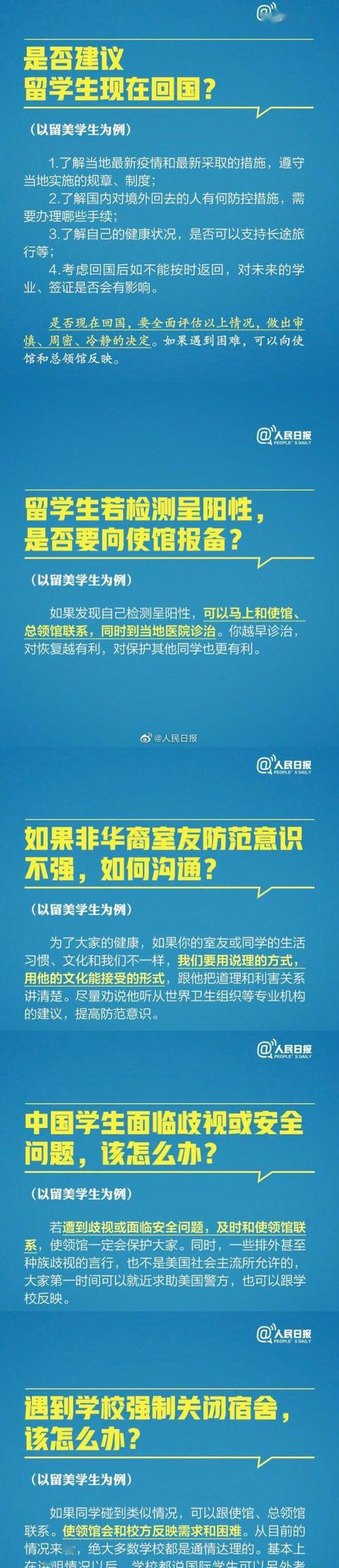 另外,如果已经在当地检测出阳性,一定要及时向使馆和总领馆上报,及时到医院就医。遇到同宿舍非华裔同学防范意识不强,可以用说理的方式给他们讲明利害,相信他们会明白的。如果在境外遭到歧视甚至威胁到人身安全,可以通过报警的方式解决。如果宿舍关闭限期搬出,可以向使馆反映求得帮助,或者暂时在外租房居住。